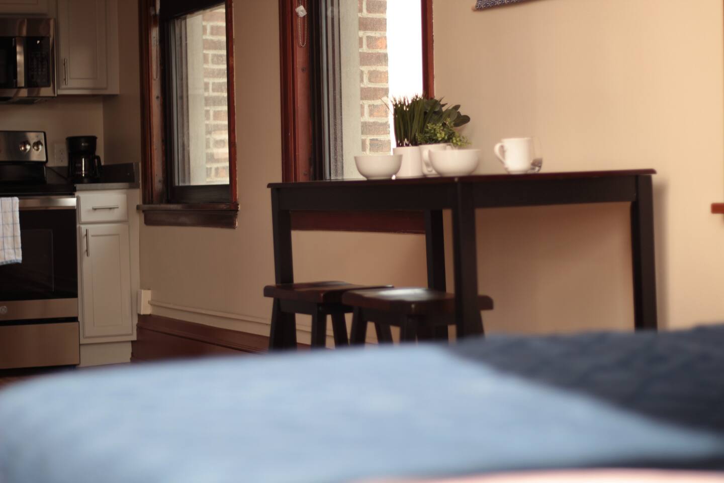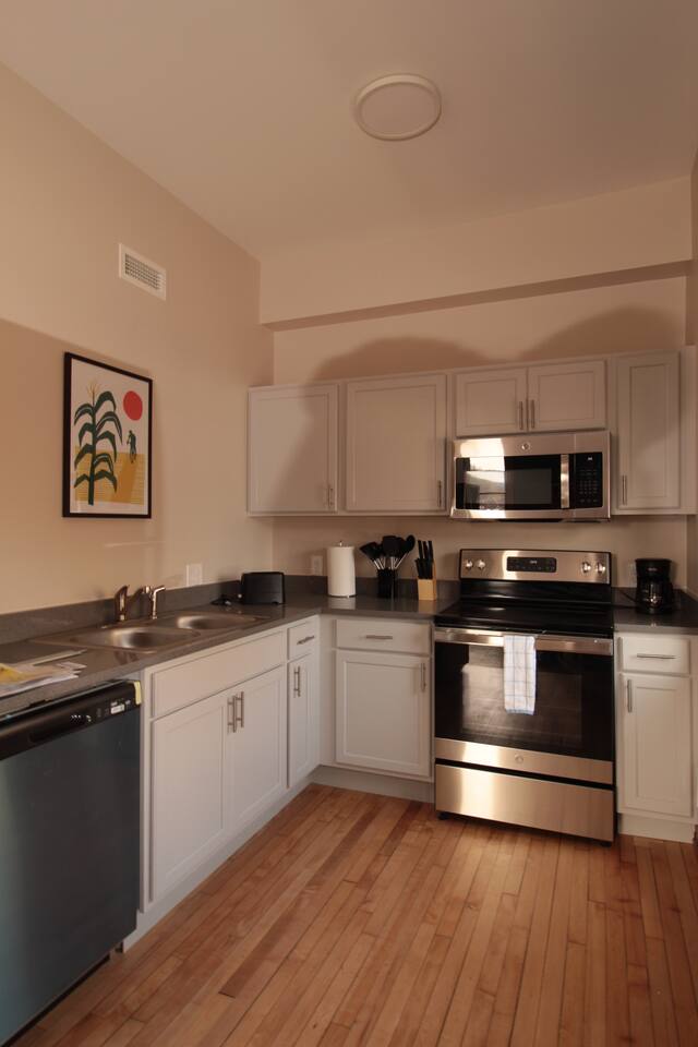This studio bedroom comfortably sleeps 2 people on a king size bed. Spacious open area offers original flooring, high ceilings, large windows with lots of natural light, and tons of character. Our modern kitchen boasts granite countertops and stainless-steel appliances. Convenient in unit washer and dryer are provided. Wi-Fi and secured bike storage included. In walking distance to local attractions, coffee shops, restaurants, brewery, bars, movie theater, parks and walking/biking trails, Mississippi River, Winona State University and more! Have a larger group? Rent more than one room at a time. The whole first floor and part of the second floor are short-term rentals! To view other listings simply click on our profile and see 'other listings'.